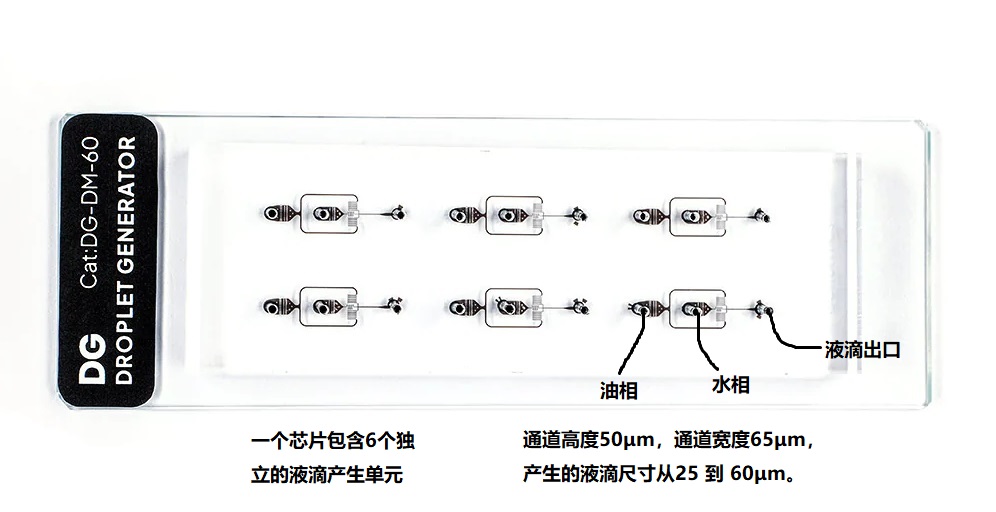 ●  PDMS液滴芯片:3个,可产生40到150μm直径的油包水液滴微球;
