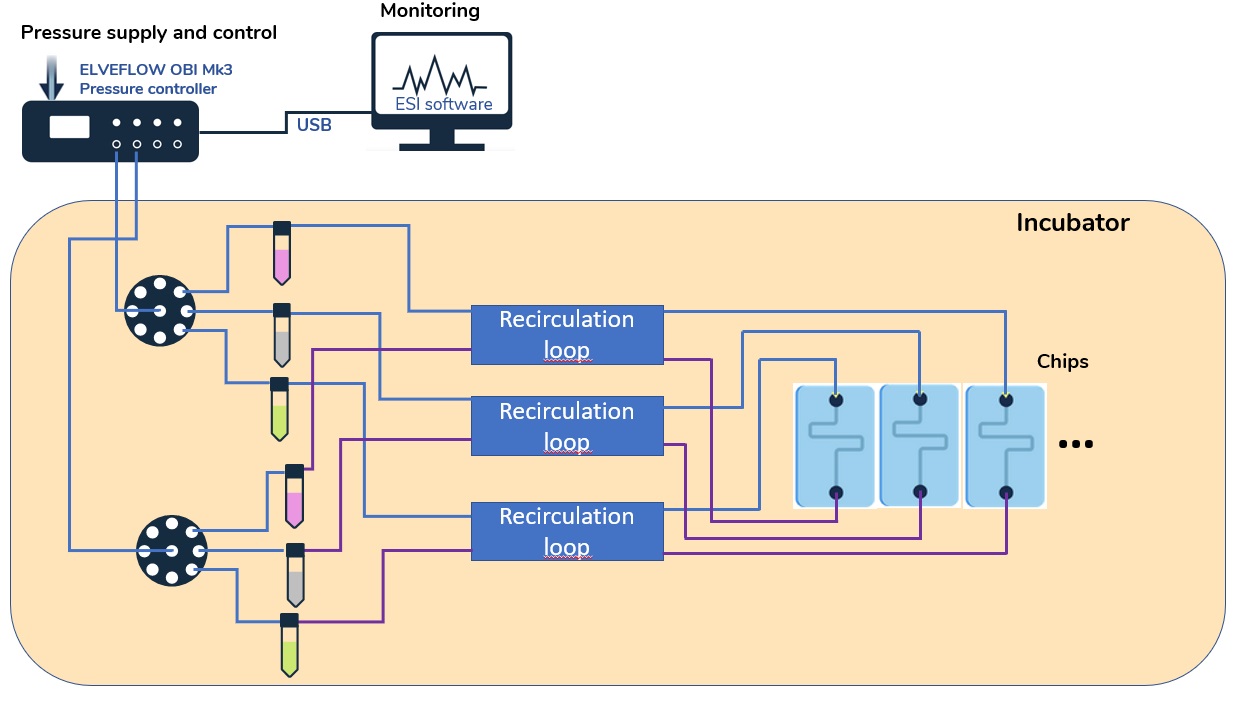 微流控技术是目前进行动态细胞培养和在生理相关条件下生长细胞的一种方法。其为细胞培养提供了连续流流动,并允许您在同一个实验中共定位多种细胞类型,这是细胞-细胞相互作用研究的一个非常重要的方面。微流控仪器还与其他仪器如显微镜成像相兼容。此外,通过操作软件ESI,还可以根据实验步骤来设置自动化序列步骤以实现长时间的再循环运行。Elveflow支持集成的微流控平台,同一个系统平台中可以使用不同的芯片,以轻松并行观察不同的样品。