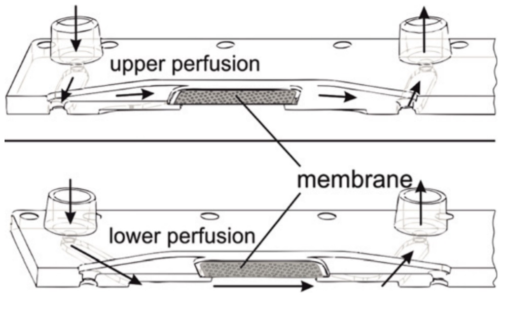 • 微流体细胞培养芯片(具有错流膜):膜片上部和下部流体流动