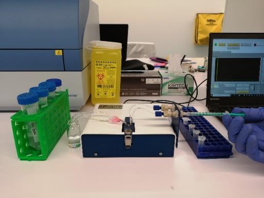 USB 供电的 P4SPR 可以连接到笔记本电脑,通过 P4SPR控制软件启动操作控制和数据记录。易于使用的界面让用户可以轻松设置 P4SPR。 首先,把微流体单元(图3)盖在金传感器芯片上并紧密固定在传感器芯片腔中。然后在样品和参比通道中注入溶液以稳定基线。 S 形样品通道具有 3 个平行的感应区域,其可以提供一式三份的样品测量以及与参考通道的一次控制测量。 通过透明通道可以在直接观察在通道中是否有形成的气 泡,以便立即清除而防止任何信号丢失。