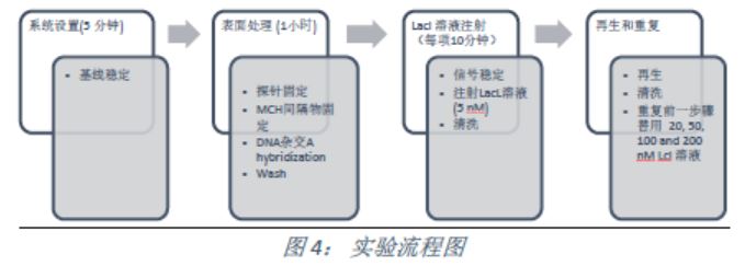 在达到基线稳定后,将硫醇化的 LacO DNA 注入样品通道。 固定化自发地造成强金-硫键形成,直到 SPR 表面饱和后产生平台信号。 然后注射互补的 LacO 寡聚体以允许杂交。在结合测定之前彻底洗涤传感器表面。 通过先前储备的液蛋白溶液来制备 5, 20, 50, 100 和200nM 的溶液。 依次注入每种逐渐增加浓度的溶液, 并用其中的大量洗涤溶液和再生缓冲液孵育 10 分钟,以从先前溶液中除去剩余的 LacI 蛋白。记录来自所有4 个通道的数据,然后导出到 Excel 进行进一步的数据分析。