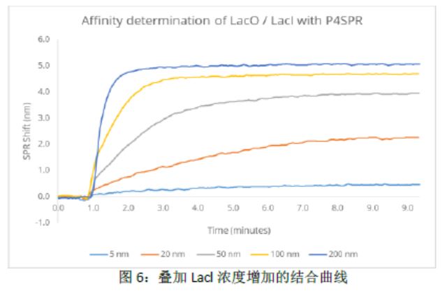 计算的 KD 为 6.4±1.2nM,符合相关低浓度基于 LacI 的转录抑制蛋白的文献报道值1。值得注意的是,与已发表论文中使用的 DNA 结合分析相比,SPR 分析不需要任何 DNA 放射性标记,并且可实时监测结合相互作用。