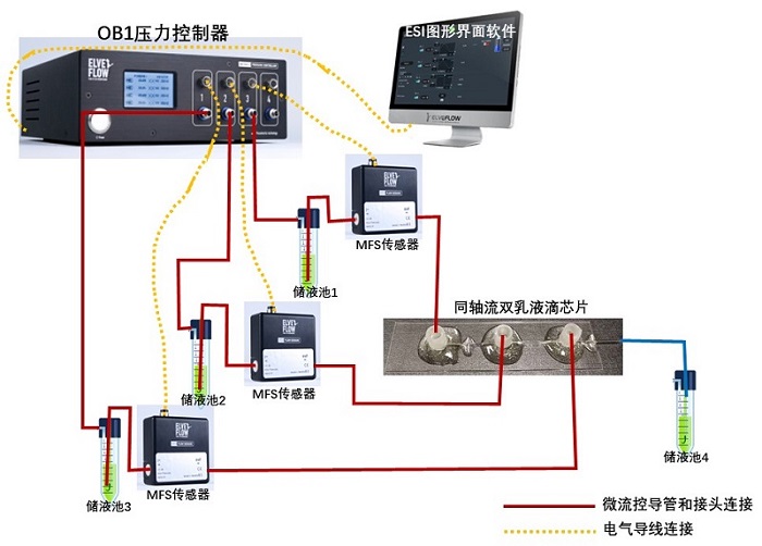 第一,将OB1压力控制器、储液池、液体流量传感器、同轴流双乳液滴芯片和电脑等按照上图所示连接在一起。