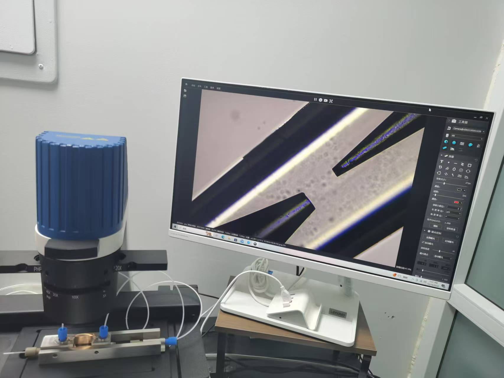 第三,在电脑上的ESI图形界面软件上设置OB1压力控制器输出的压力或液体的流量,同时在光学显微镜下观察同轴流玻璃芯片内的流体变化,然后慢慢调节压力或液体流量,直到双乳液滴的产生。