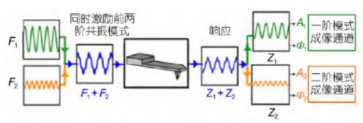 双模式(bimodal AFM)双模式 AFM[6-8]是利用两个激励力来激励微悬 臂探针的振动,激励力的激励频率通常设置在微悬 臂的两个本征共振模式下,其基本原理如下图所示,一般采用微悬臂的前两阶弯曲本征频率进行激励,一阶模式的振幅输出信号用于表面形貌成像(同传统 振幅调制 AFM),二阶模式的输出信号(振幅或相位 偏移)用于对样品表面的力学、磁学以及电学性质等成像。双模式 AFM 的两个模式具有各自获取和分离 出材料性质的信号通道[9,10],实现了直接将形貌与 其他影响针尖运动的相互作用力的分离。双模式 AFM可以在小于 100 pN 的施加力下获得样品形貌和组成成分的图像。减少施加在样品上力,最直接的方法是增加针尖-表面间距离,但这会降低样品形貌和/或耗散像的对比度,然而,双模式 AFM 在这些条件下仍可以分辨出观测 物体结构。此外,双模式 AFM 中的调幅-调频模式(AM-FM mode)可以用来研究样品的黏弹性等性质,利用两个 不同频率的激励信号来激励微悬臂振动,其中低频 的振动信号采用振幅调制模式来得到样品形貌, 而高频的振动信号采用频率调制模式来获得共振频率 和振幅,分别反映了样品的硬度(弹性)和能量耗散 (黏性)。