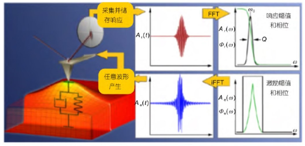频带激励法[14]是一种多频激励和探测方法,其目的是在获取样品形貌的同时获取变化的动力学曲线。除标准的锁相探测、锁相环探测以及扫频法外,频带激励法在某一频带范围内的全频率激励和响应检测给出了另外一条技术方案。频带激励引入了一个含有连续频率带的合成数字信号作为激励信号(具有确定的幅度和相位),并在同一或更大的频率范围内检测微悬臂响应[15-19],通过高速数据获取方法来对图像每一点处的微悬臂响应均进行检测并做傅里叶变换,如下图所示。在表面上的每一个点收集对应的振幅和频率曲线,存储成一个三维数据阵列,分析这些数据可以得到一些能够表征微悬臂行为的相关参数,例如,在单谐振子近似下,共振频率、振幅以及品质因子都可以通过卷积得到并存储起来作为 AFM 图像,在自适应控制下,这些参数还可以作为 AFM 的反馈信号。