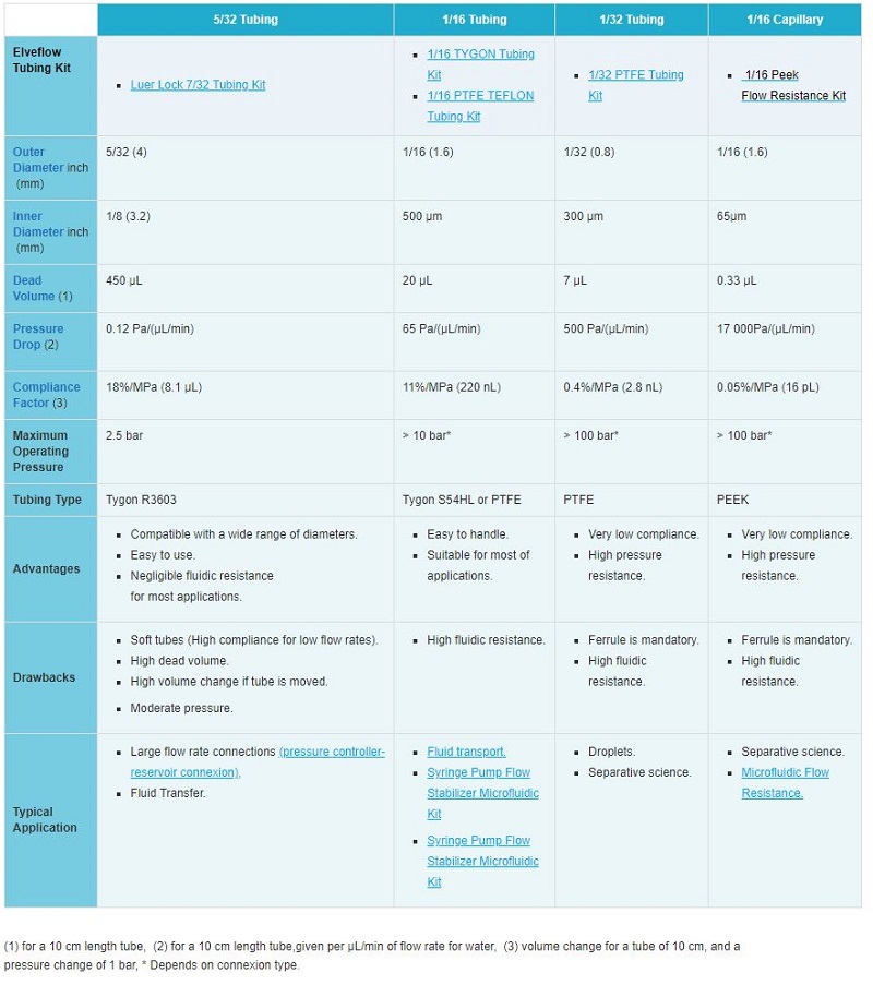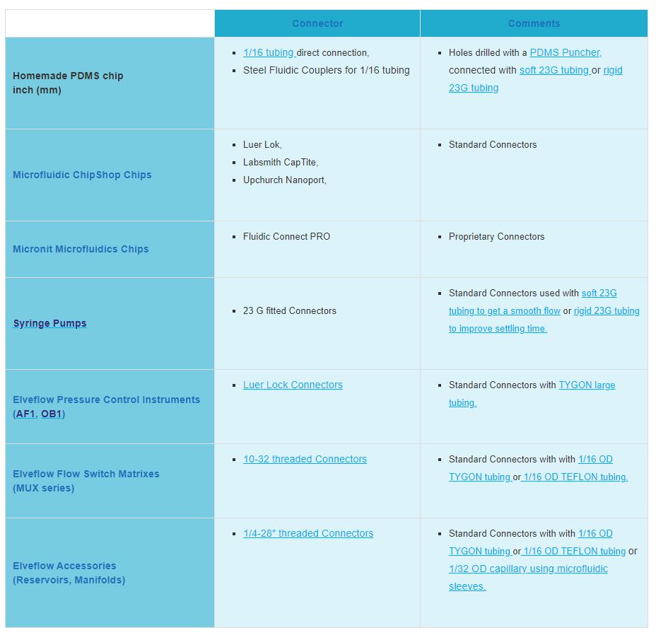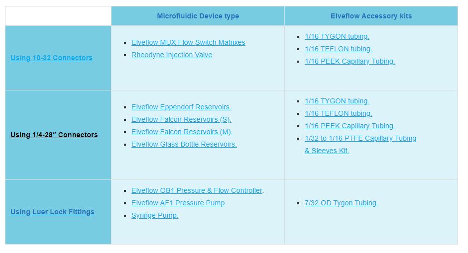 下表是一个快速指南,显示了哪些连接器适配Elveflow仪器和Elveflow附件套件。通过该表,可以快速了解需要哪些连接器和导管来确保您的仪器和微流控芯片之间的流路。