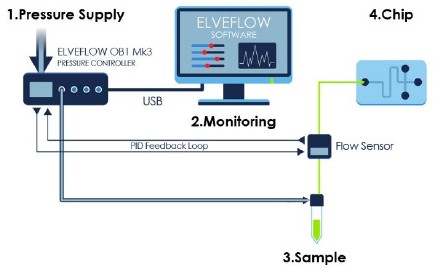 压力控制器对储液池(如Eppendorf、Falcon或含有样品的瓶子)施加压力,然后将其平稳且准瞬间注入到微流体芯片内。