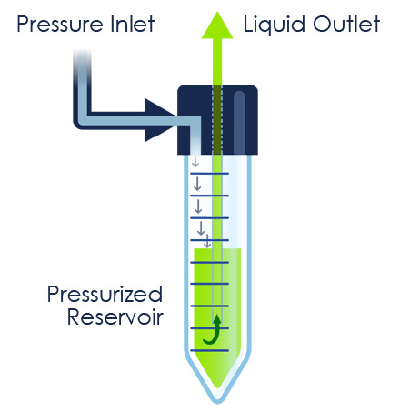 图2:储液池被加压,气体在液体表面上施加推力,液体将从储液池的出口处流出。因此,控制储液池的输入气体压力将能够控制流出储液池的液体体积。由于采用压电压力调节,Elveflow的系统能够在40 ms内调节液体流量,稳定性为0.005%。压力驱动流量控制的一个优点在于能够处理从几百mL到几μL的流体体积,因此,您可以将您的系统变成一个强大的注射泵。