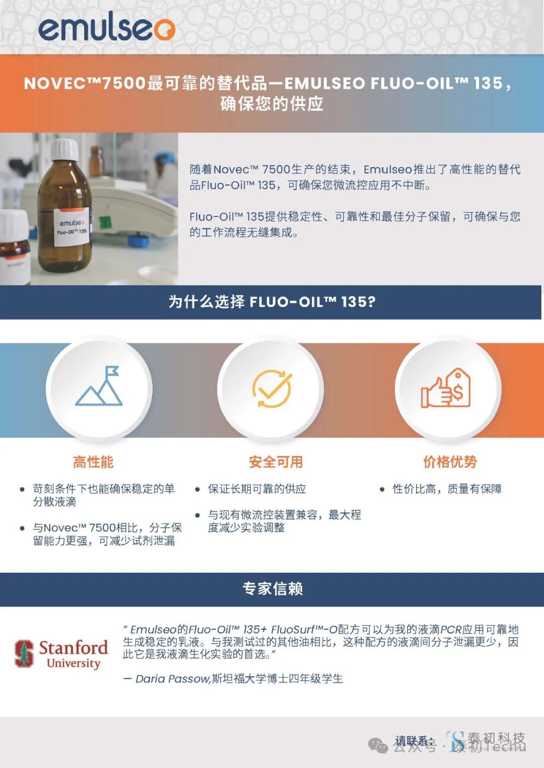 Emulseo推出替换性产品 Fluo-Oil 135氟油,具有一致的稳定性、可靠性和良好的分子保留,确保您的项目实验连续进行,不会中断。