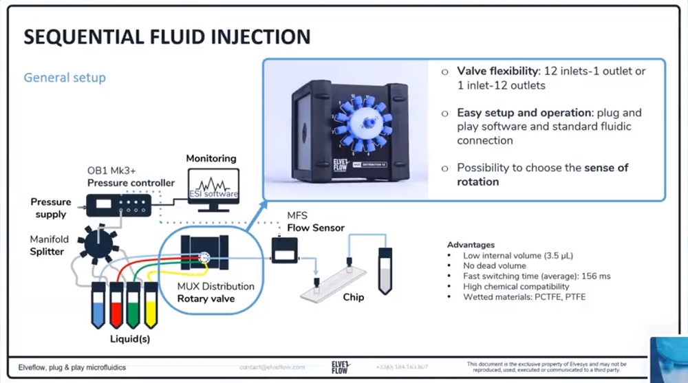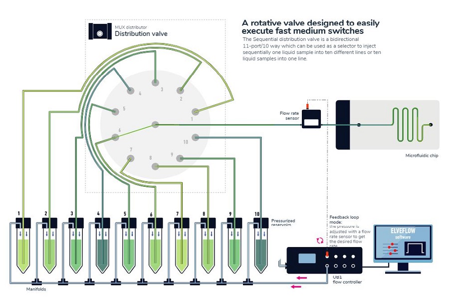 活细胞灌注套装适用于需要在不同培养介质或药物之间切换的实验。ESI操作软件控制的微流体分配阀MUX Distribution12可实现高达12种不同液体介质或试剂的顺序进样。