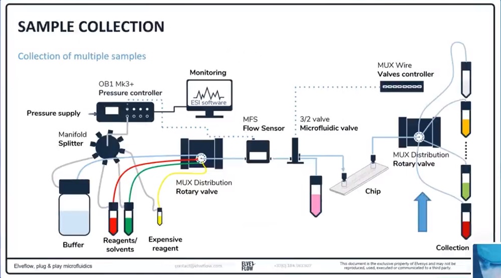 标准的活细胞灌注套装使用压力控制器OB1的一个压力输出通道将多种不同的溶液泵送入细胞培养芯片内。结合流量传感器MFS或者BFS,OB1流量控制器可以实现非常稳定的液体介质灌注。此外,使用MUX分配阀可以轻松的在12种溶液介质之间进行切换。使用一个图形界面操作软件ESI可执行所有液体切换操作,同时,ESI软件允许您使用直观的scheduler自动化序列器模块对液体流量进行调节,并使实验自动化运行。