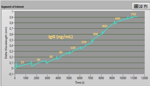 Real-time sensorgram of IgG of different concentrations (set B) binding with Anti-IgG immobilized on an AffiCoat surface using P4SPR