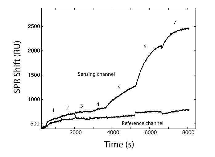 SPR sensorgram for the detection of SARS-CoV-2 anti-rN antibody in serum. Concentrations of anti-rN antibody: (1) 100 ng/mL, (2) 500 ng/mL, (3) 1 μg/mL, (4) 5 μg/mL, (5) 10 μg/mL, (6) 25 μg/mL, and (7) 75 μg/mL. The reference channel confirms that nonspecific adsorption is minimal.