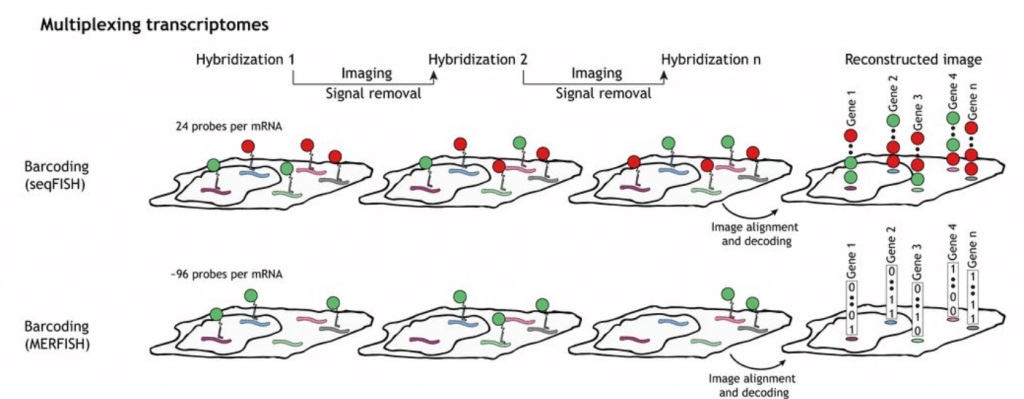 首先,用一组荧光FISH探针和标记染料进行原位杂化。然后,使用DNase去除荧光团,mRNA再次与相同的FISH探针杂化,但使用不同的标记染料。几轮杂化和其他染料允许在单细胞[4]中对几个基因进行条形编码。