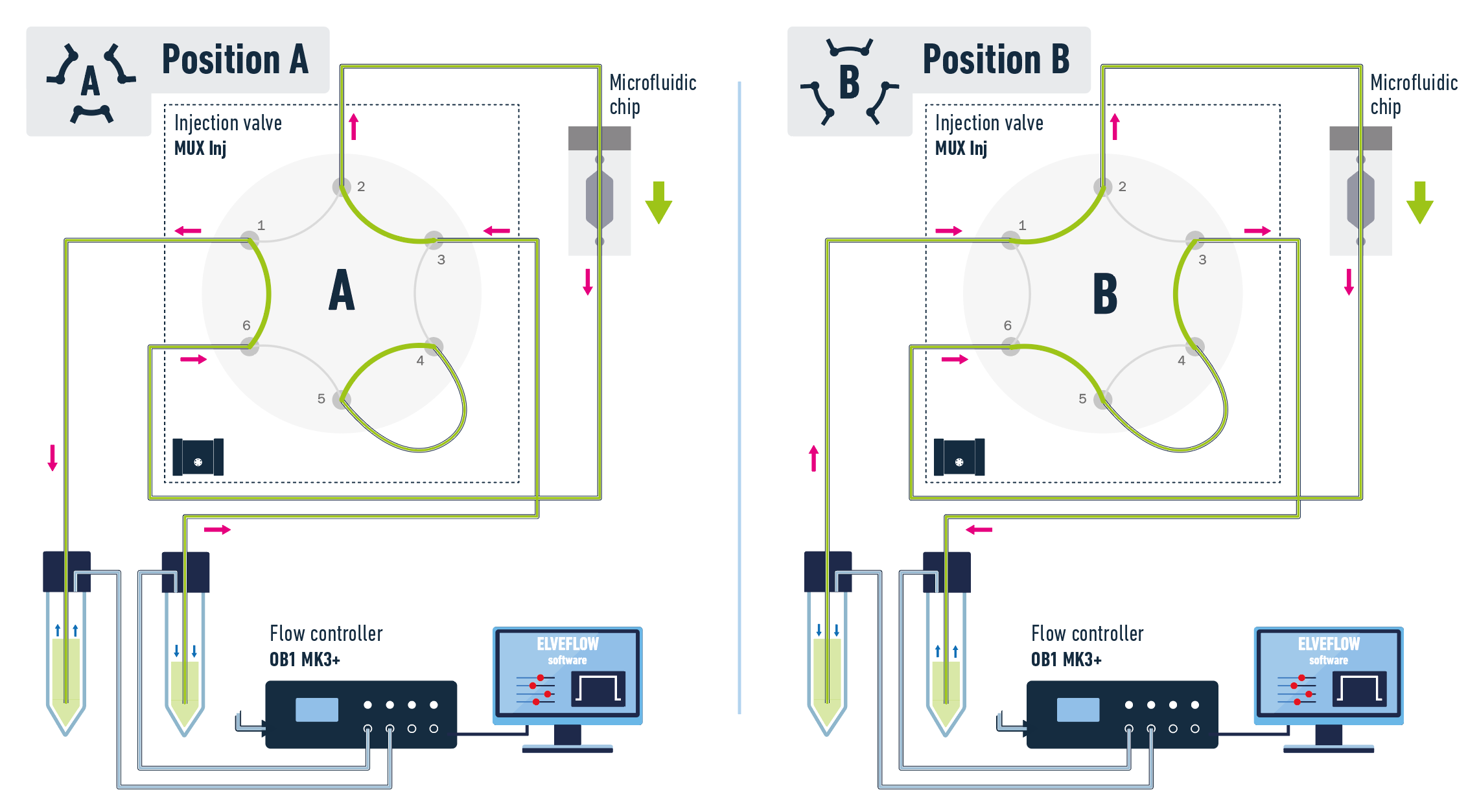 • 微流体循环阀MUX Recirculation是一个双向6-端口/2-位置切换阀,其允许在两个不同的设置配置(配置A和配置B)之间执行切换。