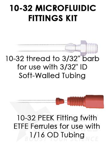 10-32UNF螺纹接头可重复使用,用于分配液体和气压。同时,可用于MPS Small压力传感器上的外径1/16英寸导管的连接和MUX Cross Chip多功能切换阀的螺纹端口连接。