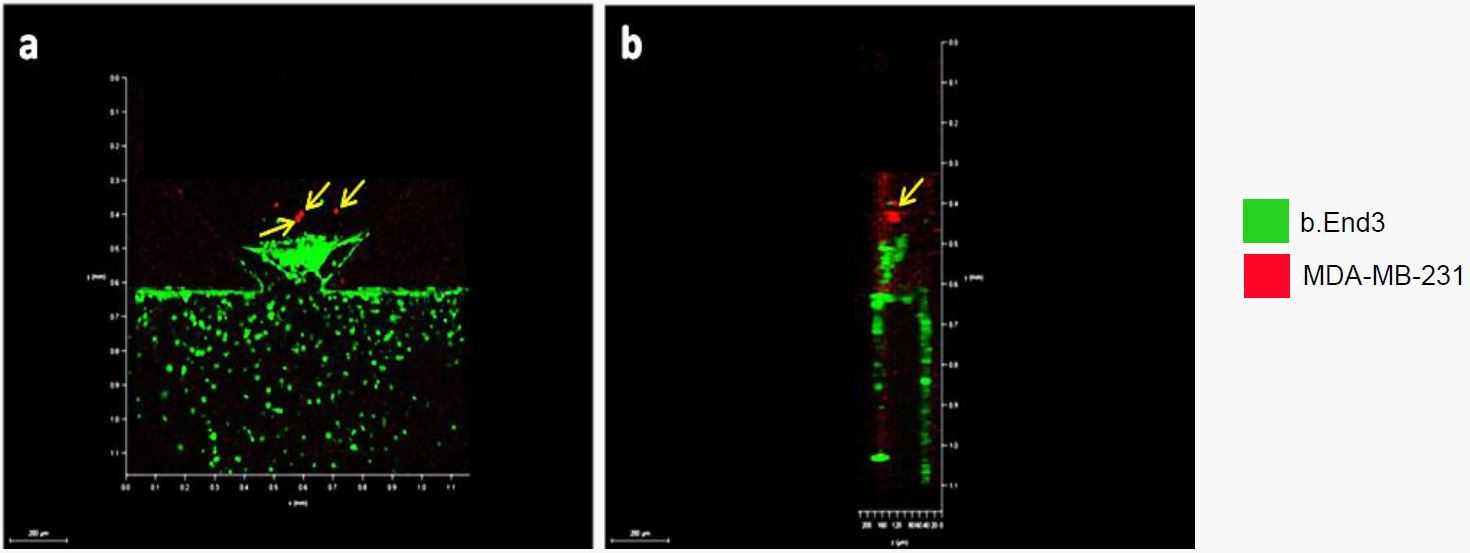 图3 荧光标记的乳腺癌细胞(MDA – MB – 231)与b.End3内皮细胞的相互作用,并通过内皮单层细胞渗入IC-Chip的基质通道。图片由Prof. Devrim Pesen Okvur提供。