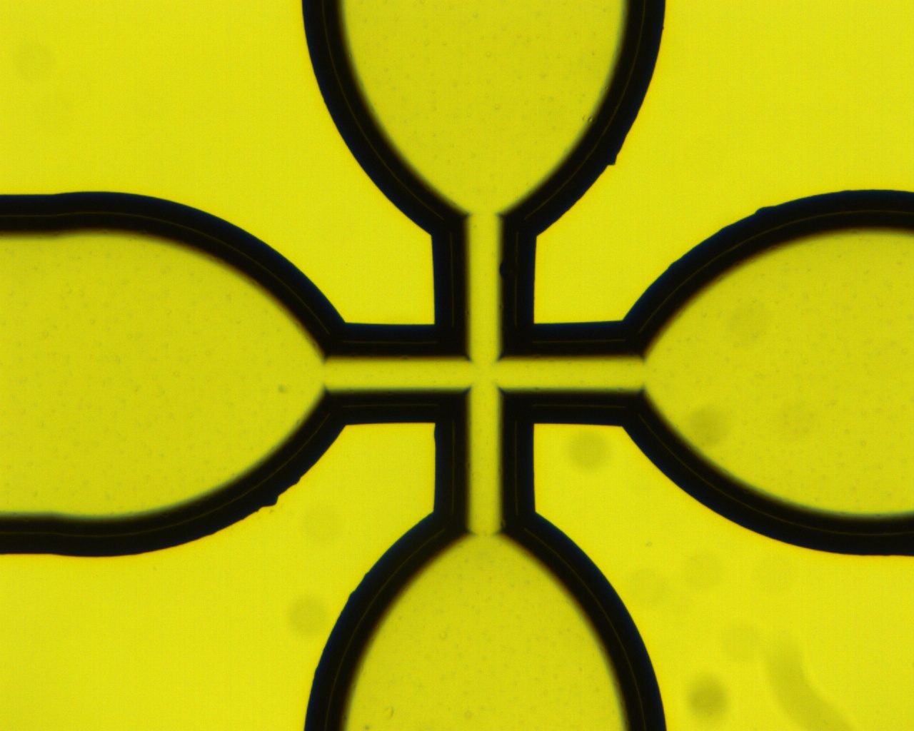 液滴微球产生结构为流动聚焦结构(也就是“十字”型结构),缩口通道宽度200μm,深度120μm,适用于产生90μm到250μm的水包油液滴微球。
