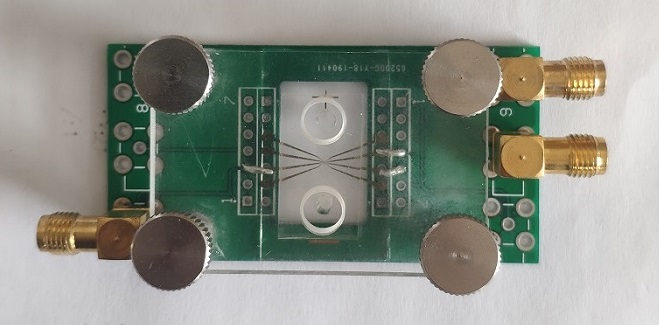 下图为挤压式PDMS电阻抗检测芯片的俯视图,顶部为流体注入和流出端口,左侧和右侧的SMC端口为电气连接端口。顶部四个圆形旋钮用于挤压和固定中间的PDMS芯片。