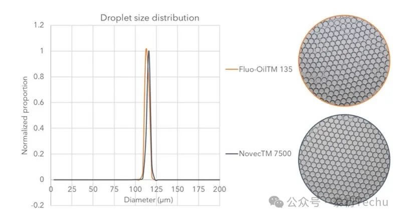 在Fluo-Oil 135和HFE7500油中,产生相似尺寸的水滴。在既定流速参数下,液滴的平均直径为110μm。液滴尺寸的CV分别为2.3%(Fluo-Oil 135油)和2.9%(HFE7500油)。