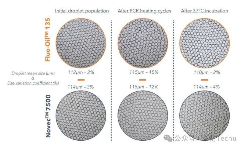 将氟化油从 Novec™ HFE 7500 切换到 Fluo-Oil™ 135 对液滴稳定性没有影响。