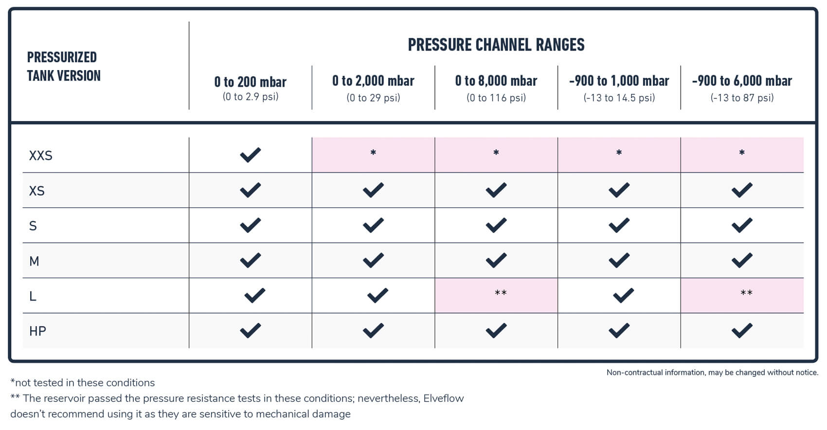 这是在压力控制器OB1 MK3+不同压力范围下使用储液池的兼容性图表。