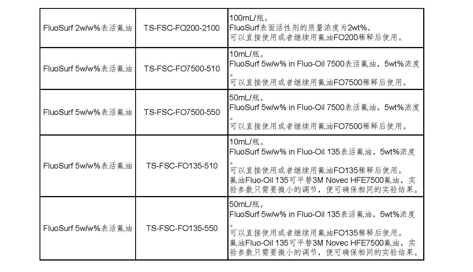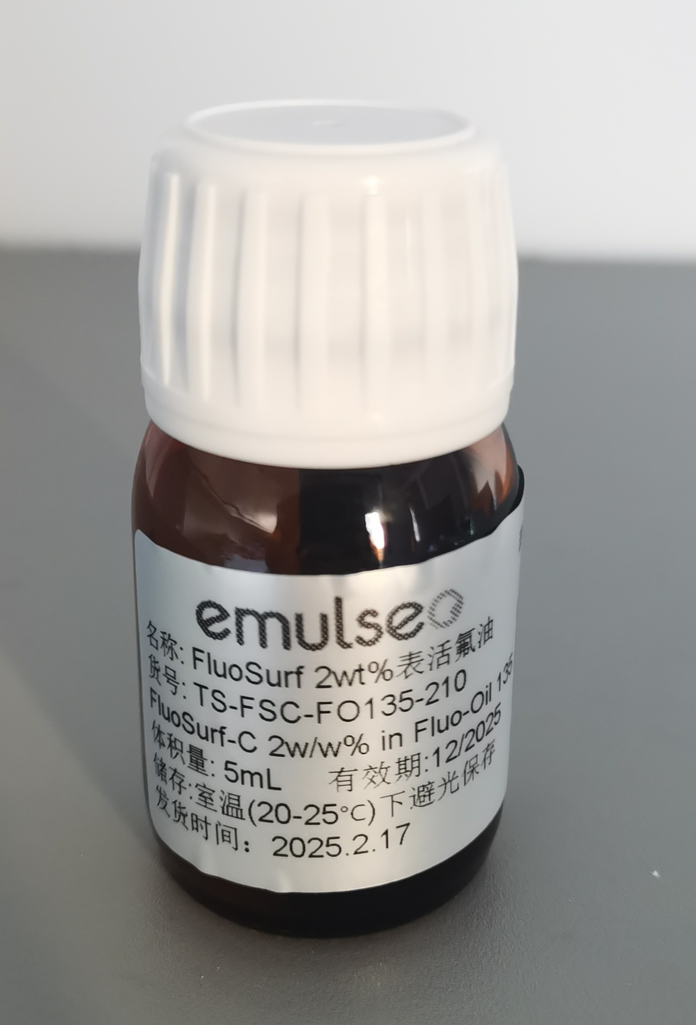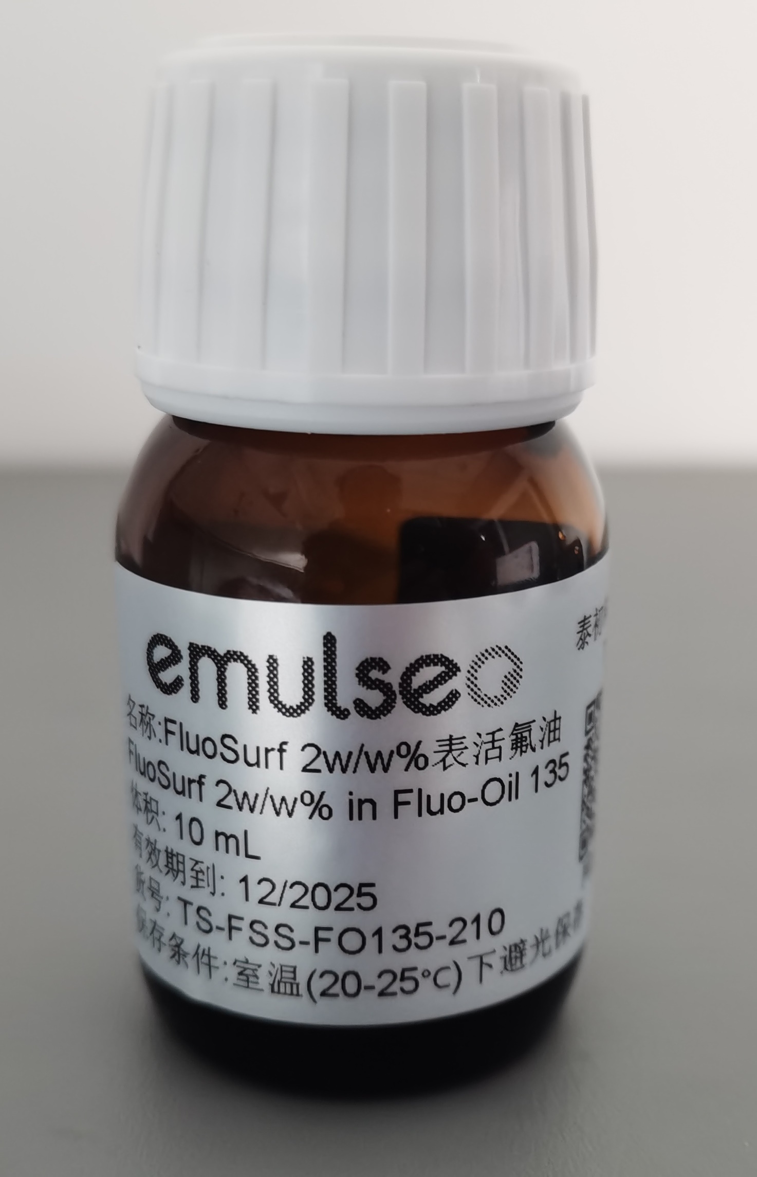 FluoSurf 含氟表面活性剂氟油FO135/FO200/FO7500/FO40 是一种生物相容性的表面活性剂油相溶液,用于各种微升级液滴微球和皮升级微液滴的应用。其作用是稳定微液滴及其细胞或分子含量。微液滴在宽广的温度和生物条件下具有高度稳定性,确保实验的可靠性和再现性。