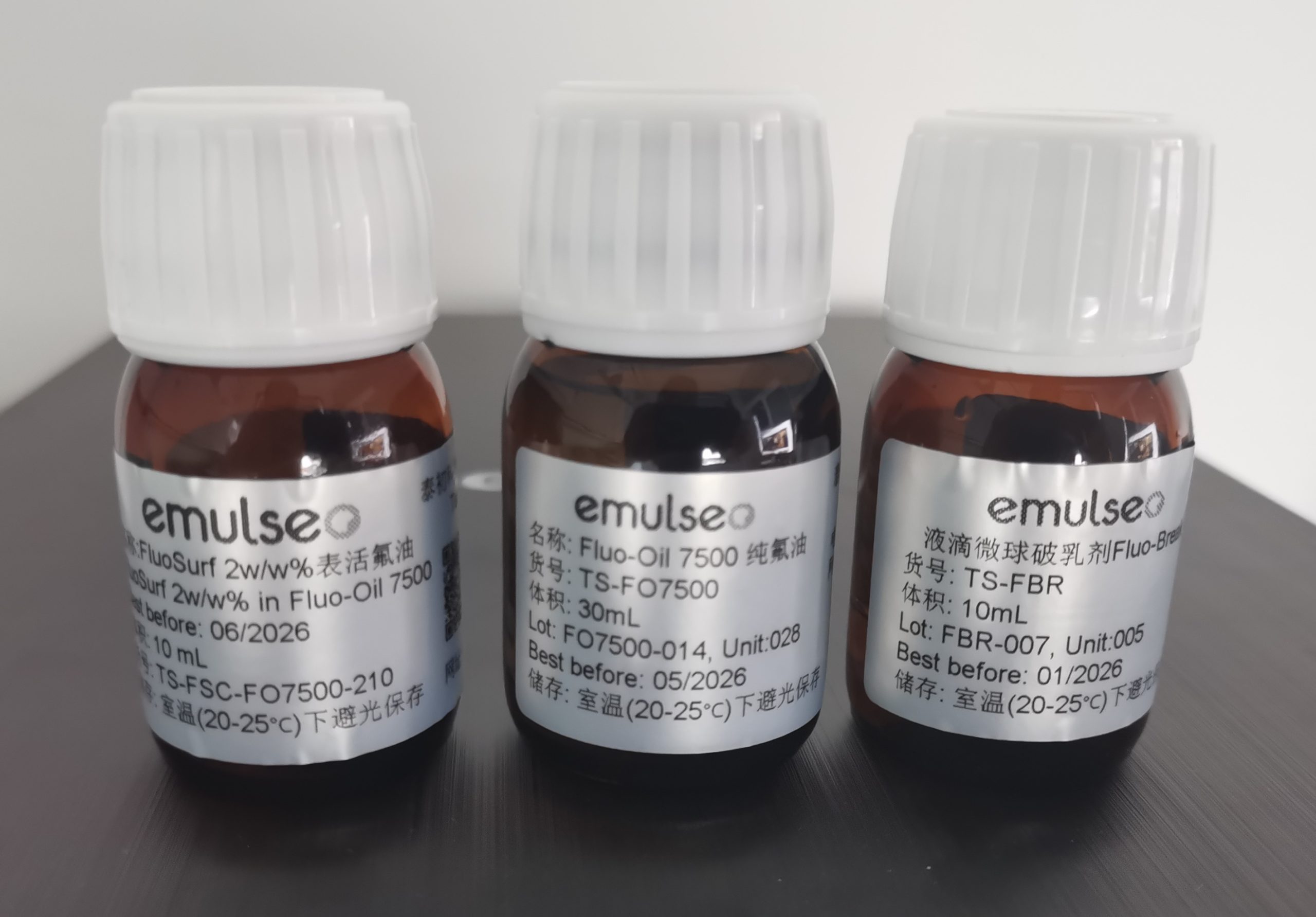FluoSurf 2w/w%表活氟油、氟油FO7500和液滴破乳剂Fluo-Break的组合套装:完成液滴微球产生、表活氟油稀释或液滴流动分隔以及液滴破碎。
