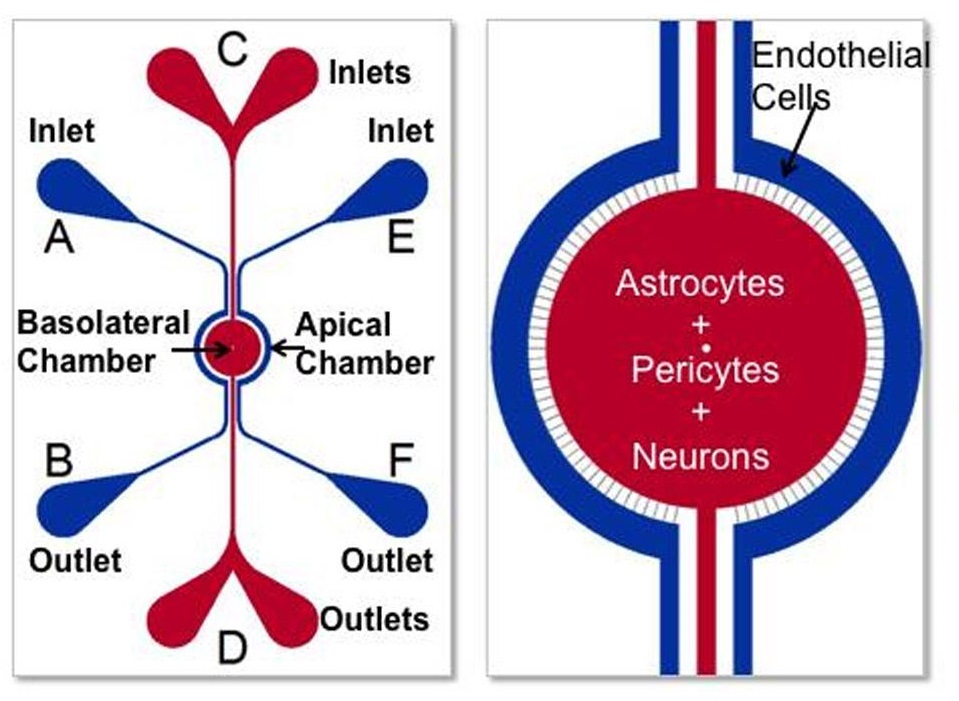 SynBBB是一种微流控芯片器件,可以通过与跨血脑屏障(BBB)的内皮细胞进行通讯的大脑组织细胞的组织学切片的复制,来重现大脑在体内微环境中的复杂性。通过生化或电学分析,在SynBBB模型中很容易观察到组织细胞与内皮细胞之间的相互作用。