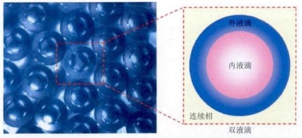 双乳化液滴微球是一种液滴里面又包含一个液滴微球的多重结构或者是由分散在其他液滴中的液滴组成的,液滴微球本身也是一种乳化剂。由于双乳化液滴微球具有封装和保护材料的功能,其在医药、化妆品、食品、化学、细胞生物学等领域得到了广泛的应用,例如为细胞培养和生物体测定提供了受控环境,活性成分的药物递送与输运载体如酶、维生素、农药、外泌体、脂质体等。当前,常见的双乳化液滴微球的形态有水包油包水(W/O/W)和油包水包油(O/W/O)型。同时,由于内相和外相的组成不同,又可以通过缩写为W1/O/W2或者O1/W/O2来区分内相和外相。
